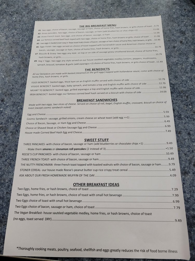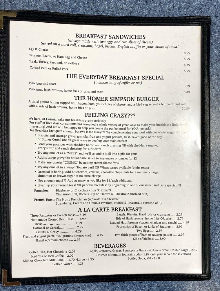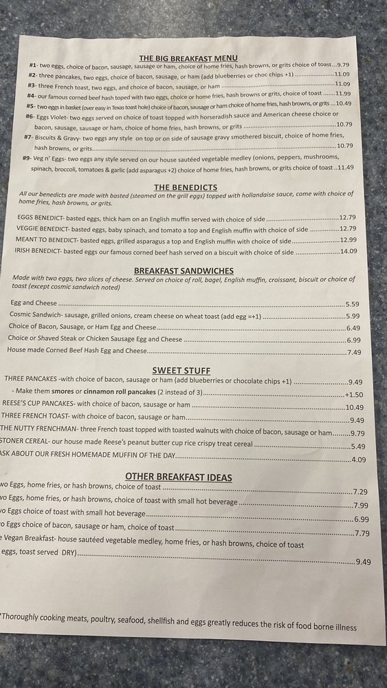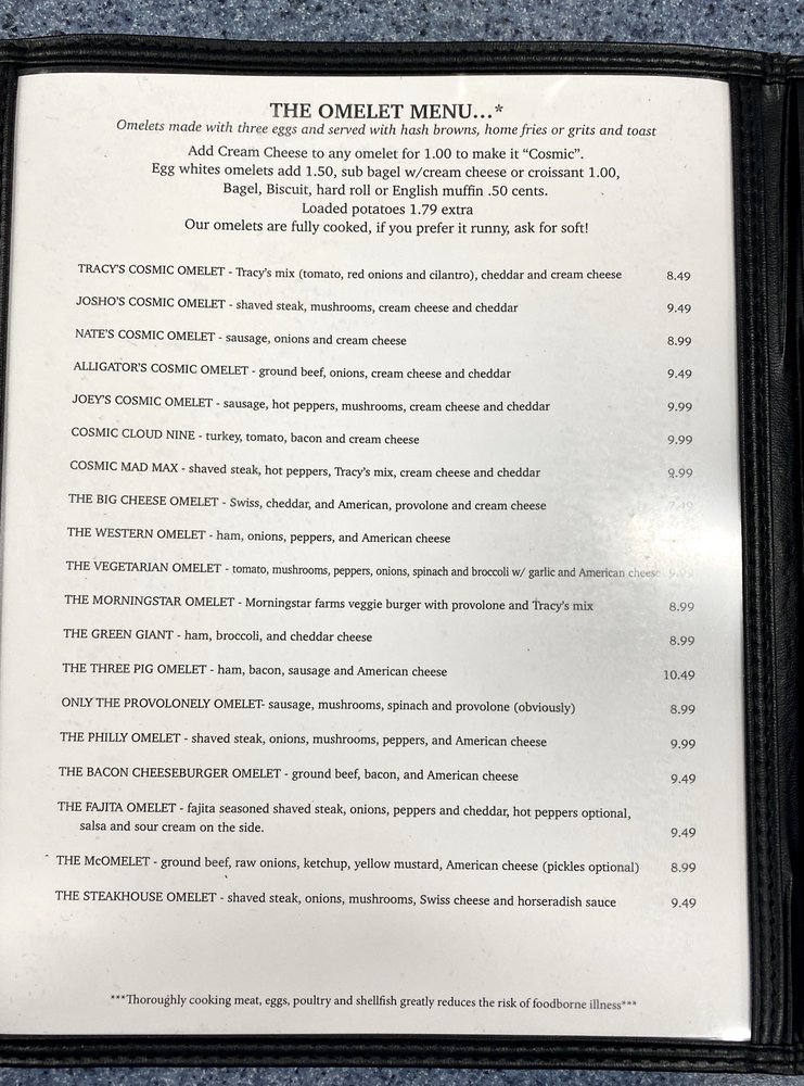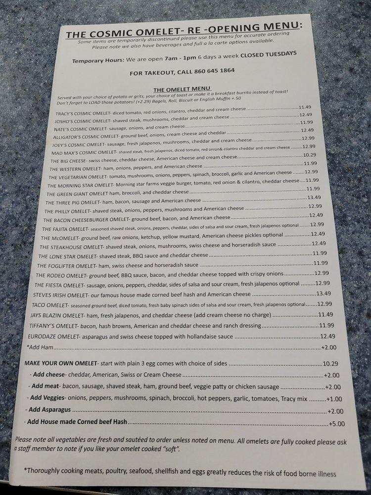 Introducing the menu at Cosmic Omelet, a breakfast and brunch spot in Manchester, CT, offers a unique dining experience. With a variety of omelet options like Tracy's Cosmic Omelet with a mix of tomato, red onions, and cilantro, or Josho's Cosmic Omelet with shaved steak and mushrooms, there is something for everyone. Customers rave about the cool interior design that feels like stepping into a Rick and Morty episode. The menu features customizable omelets with a selection of meats, cheeses, and veggies to create your perfect dish. The Fajita omelet with loaded hash browns and toast is a standout choice. Although some patrons mention concerns about cleanliness, the delicious food, excellent service, and one-of-a-kind atmosphere make Cosmic Omelet a must-visit for breakfast enthusiasts.